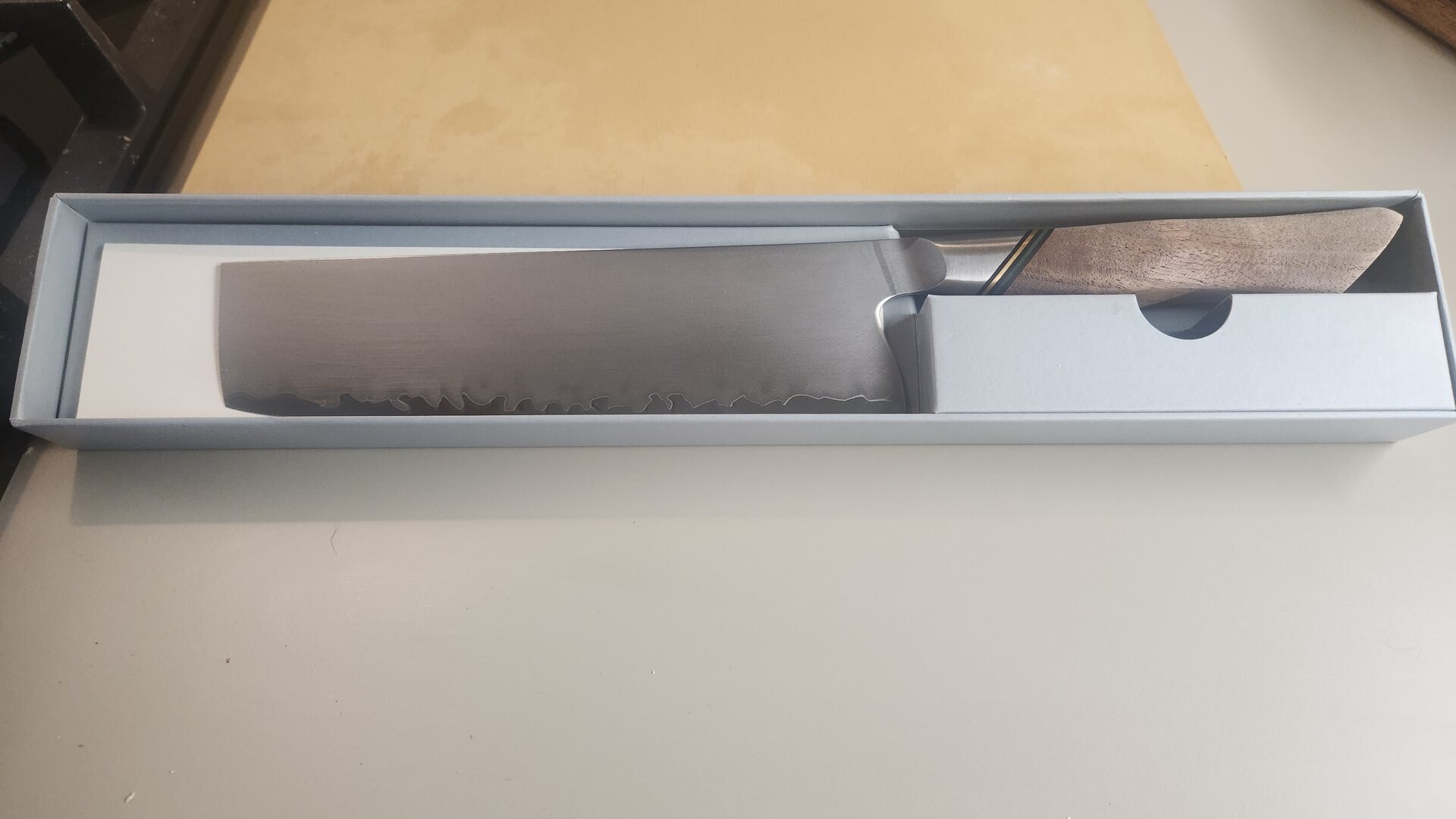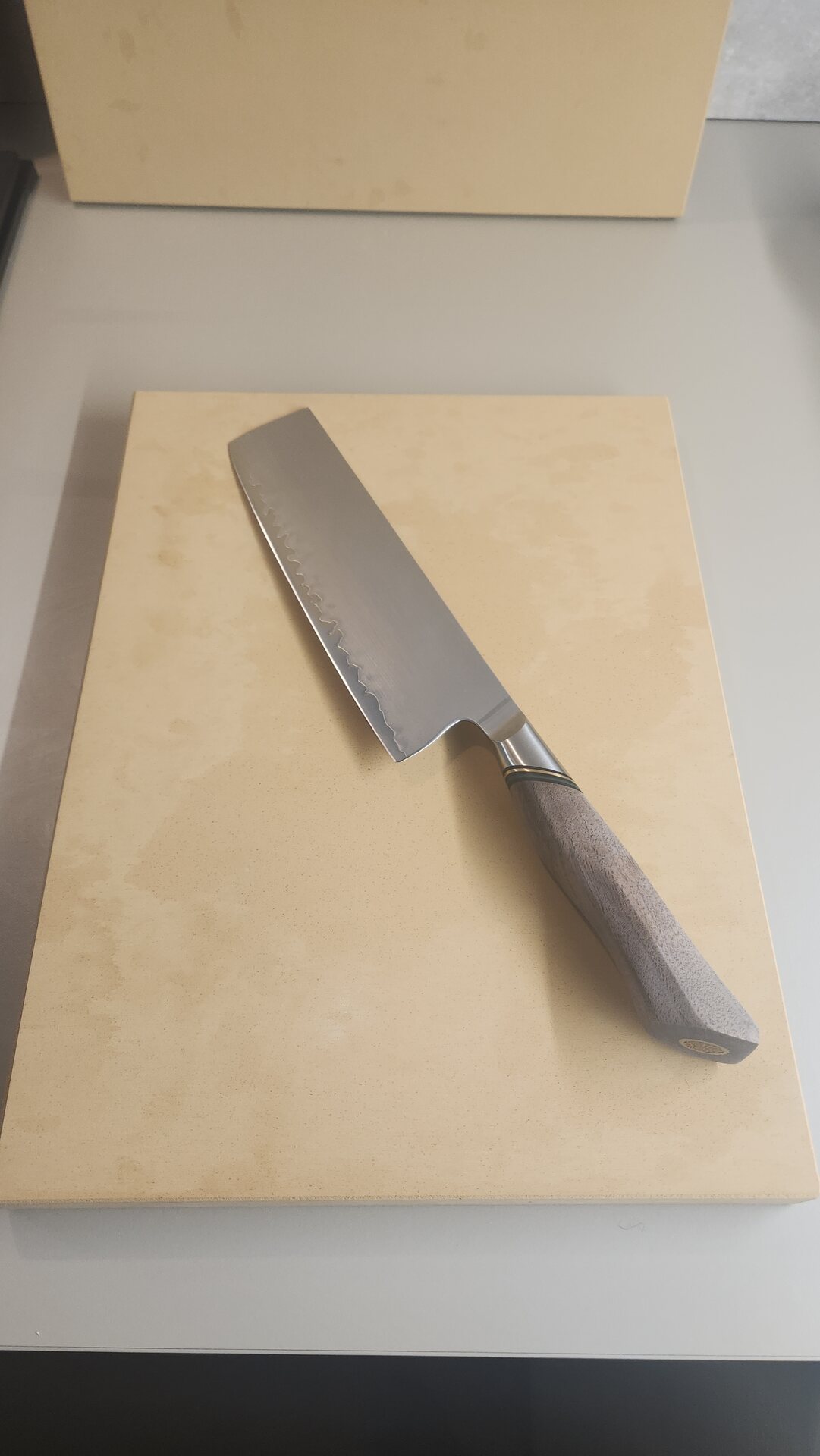 The blade features a 3-layer steel with an AUS-10 steel core, achieving a hardness rating of 60 HRC for easy sharpening. The steel undergoes a vacuum treatment for enhanced durability. The edge is sharpened to 15 degrees on each side.