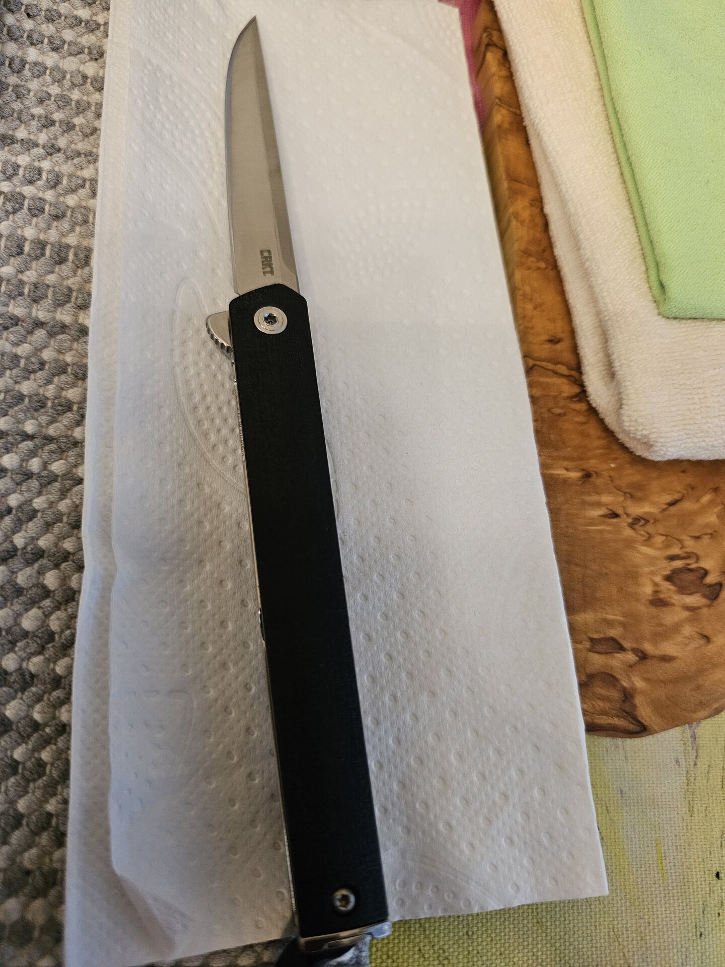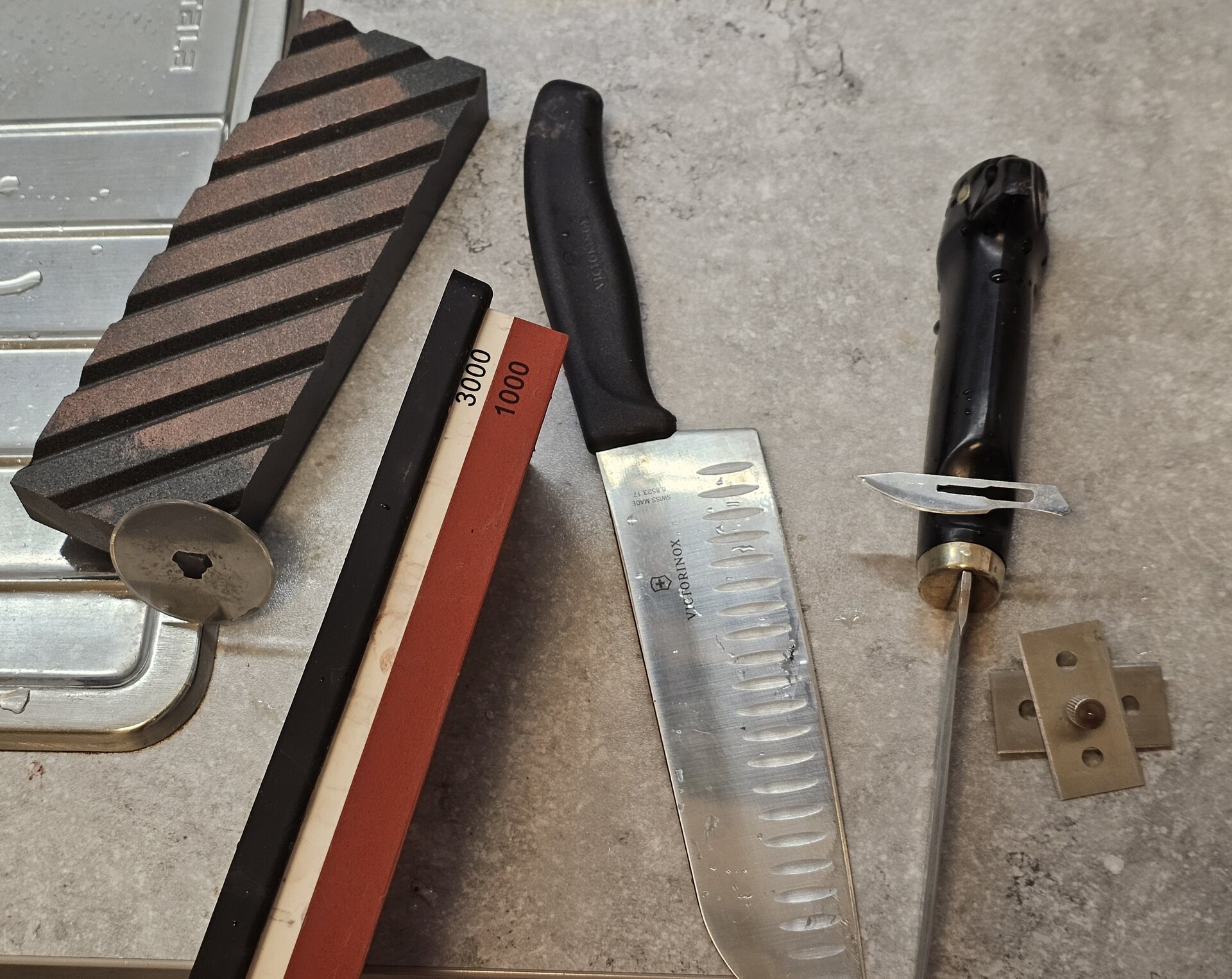 Aluksi oli vähän epätoivoa teroittamisen suhteen kun kokeilin noname-keittöveitseen. Puinen leikkuulauta puristimella pöytään ja seisaaltaan aloin kokeilemaan. Löytyi kyljestä tunnistamattomia lihaksia tai niitten paikkoja kun yritin terottaa. Kivi pysyi hyvin paikallaan liukuesteen päällä vaan terää ei tullut. Kokeilin ohjainta ja ei vieläkään. Vaihdoin sitten sellaisen puukon mistä tiedän että saa hyvän terän ja jo alkoi toimimaan ja terä parani huomattavasti. Kyllähän se opettelua vaatii vaan kyllä se terä sieltä löytyy kun tuntuma tulee. "Laastin" haju jää leijumaan käytön jälkeen kivistä. Liukueste toimii myös hyvänä kuivaustelineenä kun laittaa kivet kyljelleen siihen päälle. Kunhan tässä vielä treenaan niin kyllä on puukot iskussa.