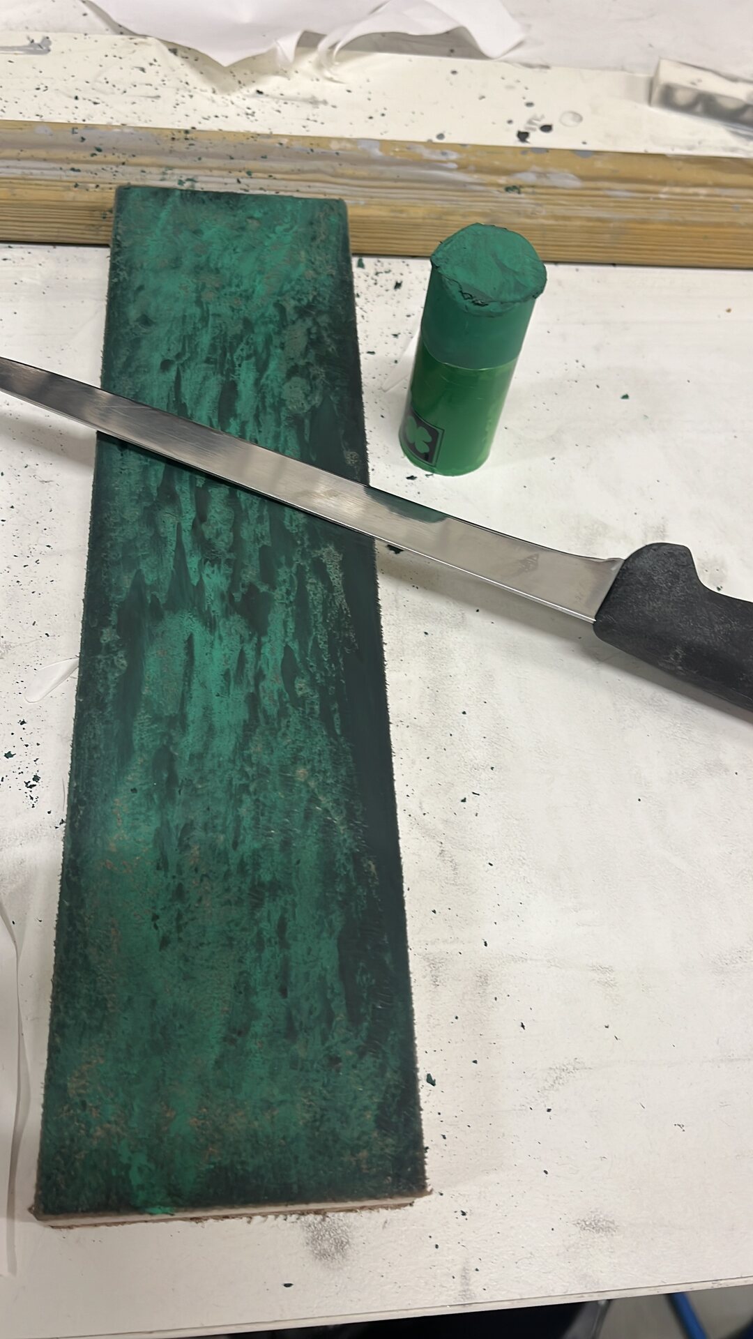 Lopullinen ratkaisu löydettiin kokeilun ja erehdyksen kautta. Käyttämämme materiaali on Grade 1 -luokan noin 4 mm paksu nahka. Kiiltävä ja kova pintakerros hiottiin pois nahan kääntöpuolelta, jolloin alta paljastui erinomainen alusta timanttiemulsioille ja pastoille.